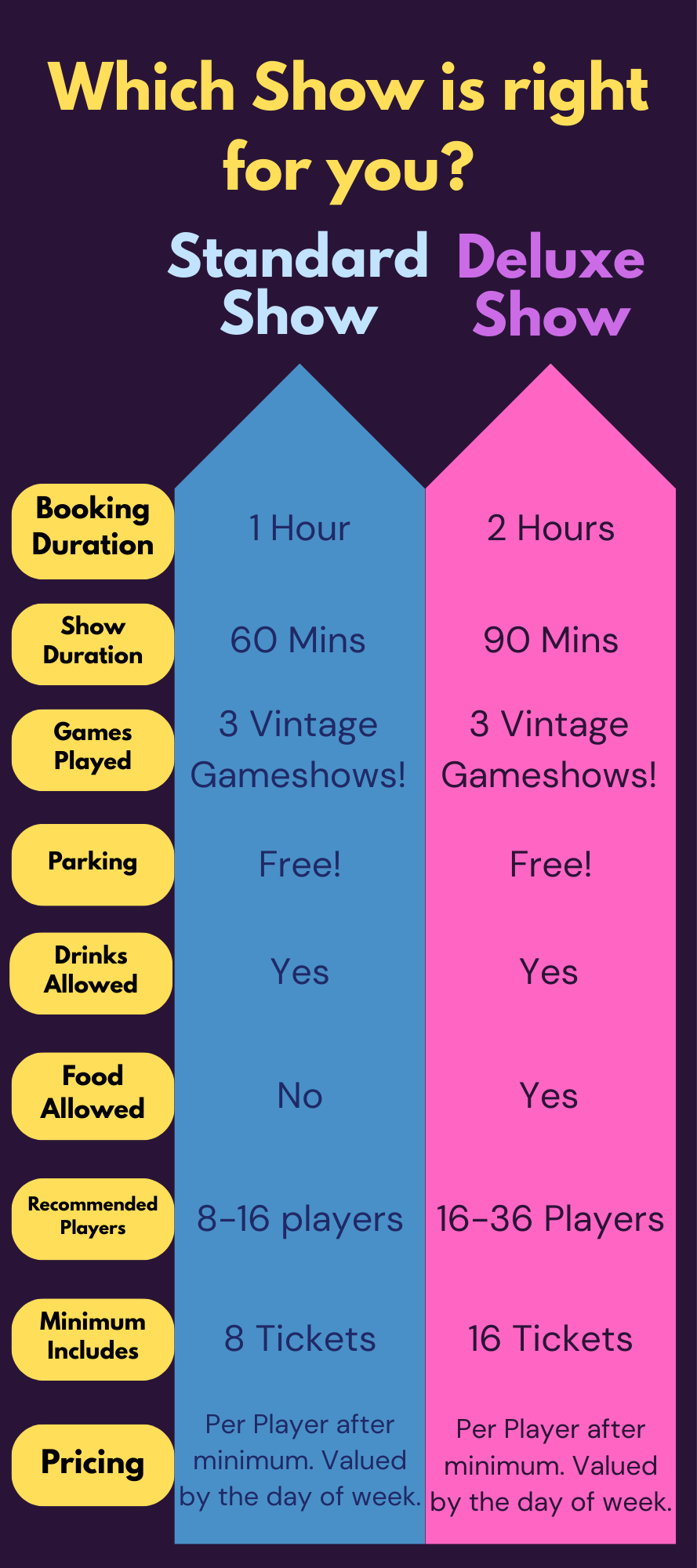 We split you into two teams, and our live hosts leads you through 3 games inspired by classic TV game shows you know and love- relay style! Half of each team will be playing and winning points, and the other half will be audience members cheering for their team! As you rotate through games you’ll also rotate between playing and watching, so everyone gets a chance to spin wheels and hit buzzers!Your whole event will take 2 hours to complete, that's 1.5 hours of gameplay and 30 minutes for getting settled and team switching throughout.